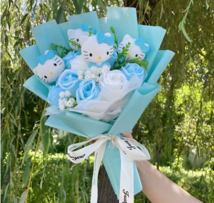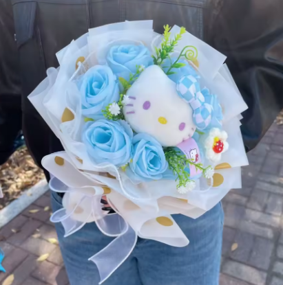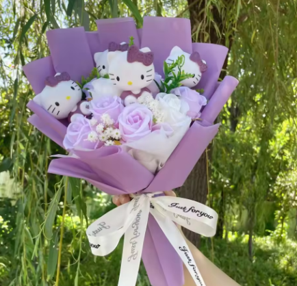 Ten wyjątkowy bukiet został starannie wykonany z wysokiej jakości sztucznych kwiatów, które do złudzenia przypominają prawdziwe. Kompozycja została ręcznie ułożona z dbałością o każdy detal – od harmonii kolorów, po estetyczne wykończenie i dekoracyjne elementy z motywem Hello Kitty. Dzięki trwałym materiałom bukiet zachowuje swój piękny wygląd na długo i stanowi oryginalną alternatywę dla klasycznych, żywych kwiatów. To prezent, który nie więdnie i może być piękną pamiątką.